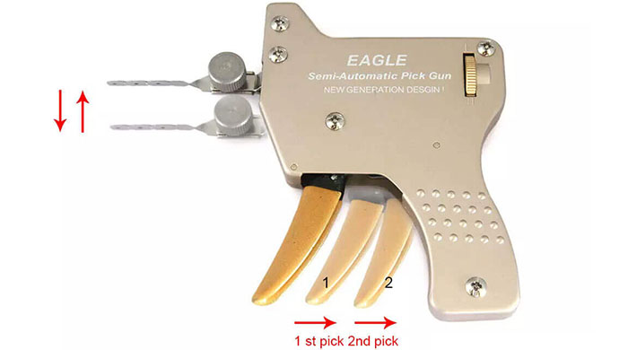 Пікган – прилад, який посилає імпульс усередину замку. У цей момент всі штифти починають рухатися одночасно, циліндр починає обертатися. Це стає причиною розблокування замка.